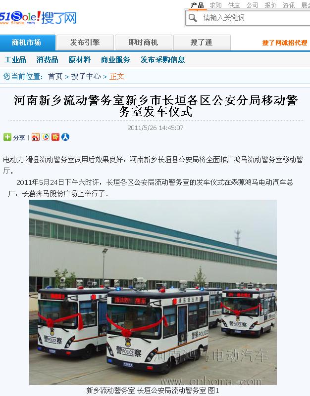 2011年5月21日下午四時許,首臺嶄新的鴻馬流動警務(wù)室發(fā)車儀式在森源鴻馬廣場舉行。明日即將投入河南省滑縣所屬轄區(qū)執(zhí)行治安巡邏,推進(jìn)滑縣公安系統(tǒng)警力下沉服務(wù)社區(qū)市民。
