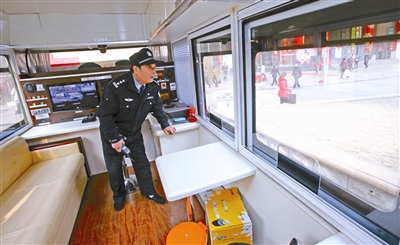 近日,一輛酷似“警察崗?fù)ぁ钡姆叫纹嚦霈F(xiàn)在天津?yàn)I海新區(qū)解放路金街。據(jù)了解,該車是由新區(qū)公安局配備的流動警務(wù)室,警務(wù)室車不到10平方米的空間內(nèi)功能齊全。記者看到,該車屬于可移動式純電瓶車,內(nèi)部設(shè)有電臺,與110指揮中心聯(lián)動;并配有連接公安系統(tǒng)的網(wǎng)絡(luò)視頻、警務(wù)監(jiān)控操作平臺等辦公設(shè)備,還配有飲水機(jī)、醫(yī)藥箱、傘具等便民服務(wù)工具,向市民提供幫助。有市民表示,流動的“派出所”搬家到了自己的身邊。目前已有兩輛流動警務(wù)室車投入使用,分別設(shè)置在金街和洋貨市場。