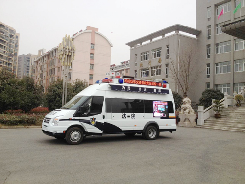 該車集訴訟服務(wù)、巡回審判、法制宣傳、執(zhí)行指揮四大功能于一體,車內(nèi)設(shè)置有審判桌椅、電子公告牌、室外LED屏、審判法庭信息化系統(tǒng)等一系列設(shè)備。為保障全天候運(yùn)行、特殊情況下執(zhí)法,還專門裝配了高功率照明攝像頭系統(tǒng)、擴(kuò)音設(shè)備等器材,是一個(gè)智能化、小型化、移動(dòng)式的“科技法庭”。
