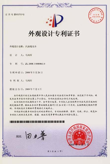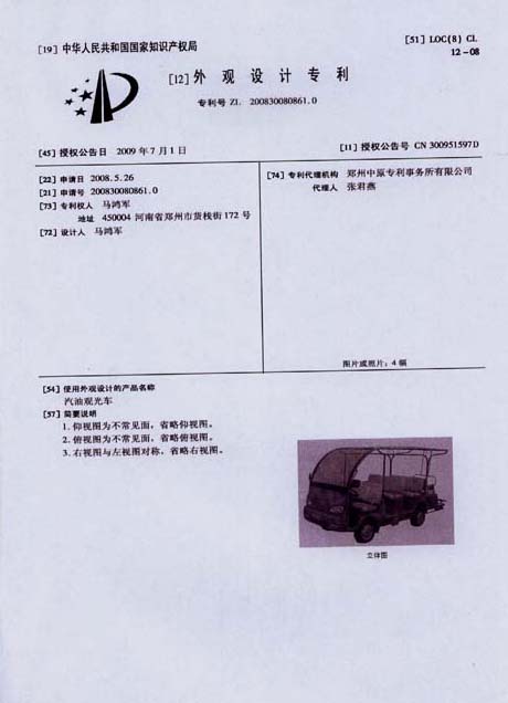 鴻馬電動(dòng)汽車公司生產(chǎn)的汽油觀光車,外觀設(shè)計(jì)已獲專利,本外觀設(shè)計(jì)巾幗中華人民共和國國家知識(shí)產(chǎn)權(quán)局依照中華人民共和國專利法進(jìn)行初步審查,決定授予專利權(quán),頒發(fā)外觀設(shè)計(jì)專利證書并在專利登記簿上予以登記。