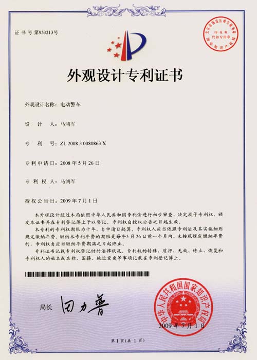鴻馬電動(dòng)汽車公司生產(chǎn)的電動(dòng)警車,外觀設(shè)計(jì)已獲專利,本外觀設(shè)計(jì)巾幗中華人民共和國(guó)國(guó)家知識(shí)產(chǎn)權(quán)局依照中華人民共和國(guó)專利法進(jìn)行初步審查,決定授予專利權(quán),頒發(fā)外觀設(shè)計(jì)專利證書并在專利登記簿上予以登記。