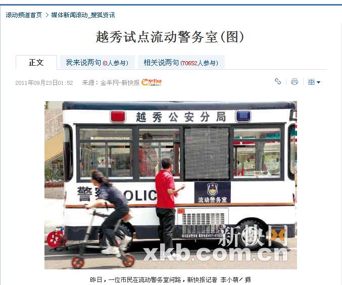 搜狐網(wǎng)報(bào)道:越秀試點(diǎn)鴻馬流動(dòng)警務(wù)室(圖)